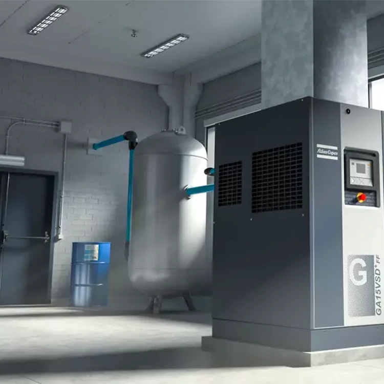 일부 공기 압축기는 "탱크 장착형"입니다. 즉, 완전한 장치로 제공되고 공기 수용 탱크 상단에 설치됩니다. 탱크형 공기압축기를 사용하면 공간 절약은 물론 개별 건조기 설치에 필요한 초기 설치 비용도 절감됩니다. 이 구성은 소형 공기 압축기에서 매우 일반적이며 출력 전력은 일반적으로 26kW(또는 35마력)를 초과하지 않습니다. 대형 공기 압축기는 탱크 설치 설계에 적합하지 않습니다. 이로 인해 상단이 무거워지고 잠재적으로 안전 위험이 발생할 수 있기 때문입니다.