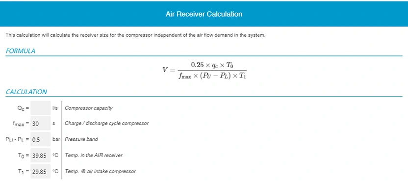 공기 저장 탱크를 선택하는 데 있어 좋은 경험 법칙은 사용되는 공기 압축기의 유형과 용도에 따라 CFM 유량당 3~4갤런의 공기 또는 초당 리터당 10~15리터의 압축 공기를 허용하는 것입니다. 공기 압축기 선택과 유사하게 시스템에 적합한 공기 저장 탱크 사양을 결정할 때 여러 요소를 고려해야 합니다. 다음 요소를 적극 권장합니다.