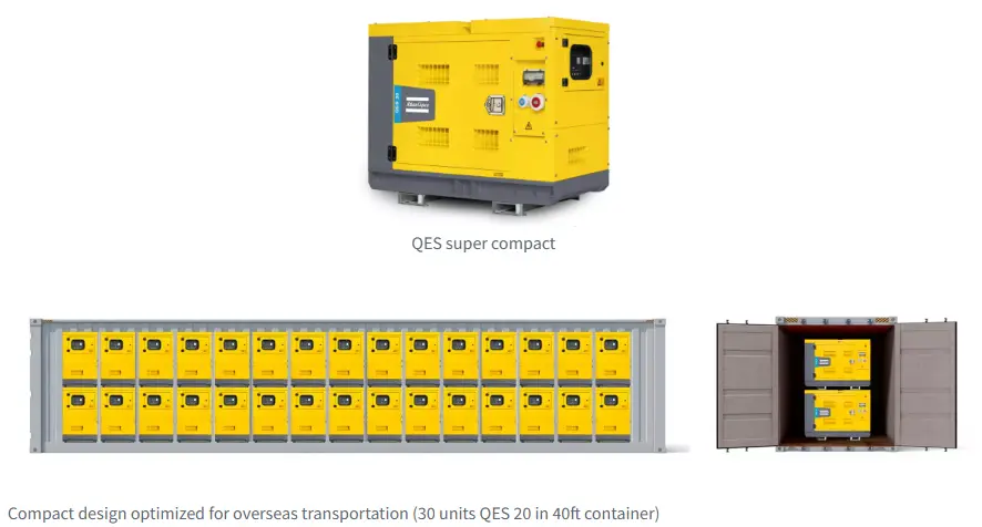 혁신적인 초소형 QES 모델은 가장 효율적인 운송을 제공하도록 설계되었습니다. 40피트 컨테이너에 최대 30개의 Atlas Copco QES 20 장치를 장착할 수 있으며, 이는 시장에 출시된 20kVA 전력 Atlas 발전기 중 가장 많은 것입니다! 이는 운송 최적화, CO2 배출 감소, 운영 비용 감소로 인해 총 소유 비용(TCO)이 절감된다는 것을 의미합니다. 환경 친화적인 디자인으로 해외 보관에 이상적이며 현장 설치 공간을 기하급수적으로 줄여줍니다.