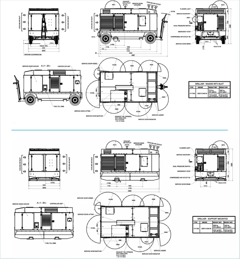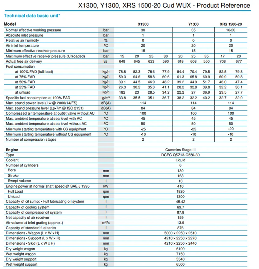 Atlas Copco X1300, Y1300 및 XRS 1500-20은 수냉식 6기통 Cummins 디젤 엔진으로 구동되는 소음이 없는 2단계 오일 주입식 스크류 압축기입니다.