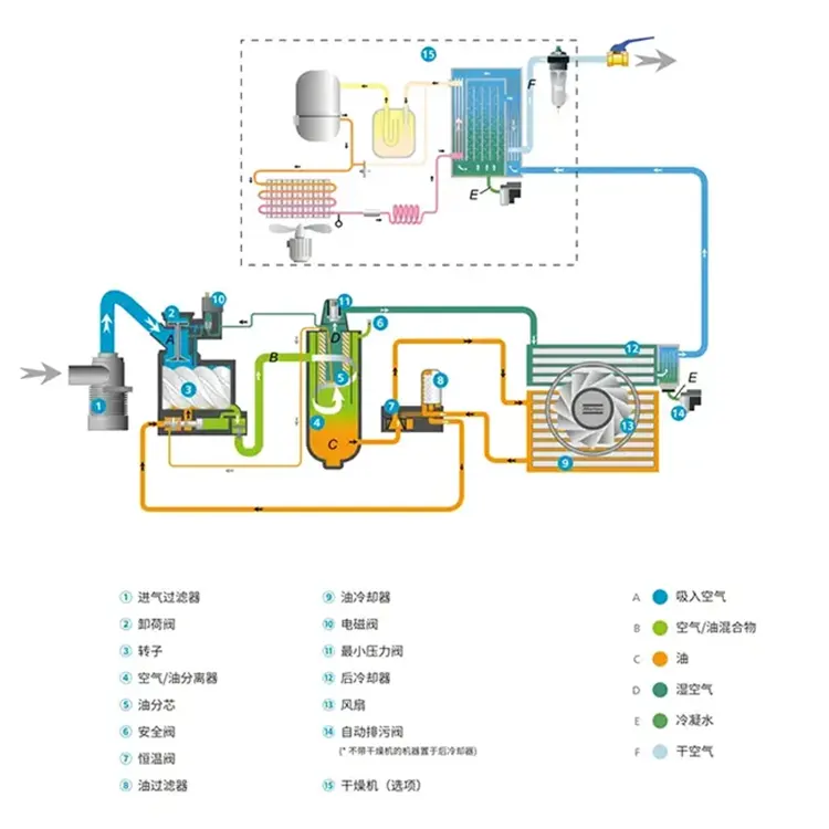 2. 보조 시스템: 윤활유 시스템, 냉각수 시스템, 전기 제어 시스템 등을 포함한 보조 시스템은 공기 압축기의 정상적인 작동을 보장하는 데 사용됩니다.