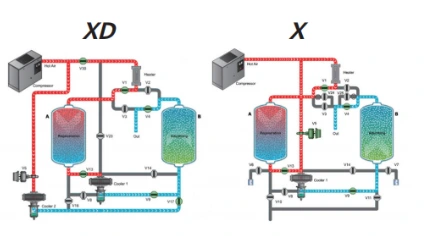 또한 XD 또는 X 압축 열 건조기는 공기 소비가 전혀 없는 건조기로서, 냉간 송풍 단계에서 에너지를 전혀 소비하지 않거나 압축 공기의 일부만 소비합니다.