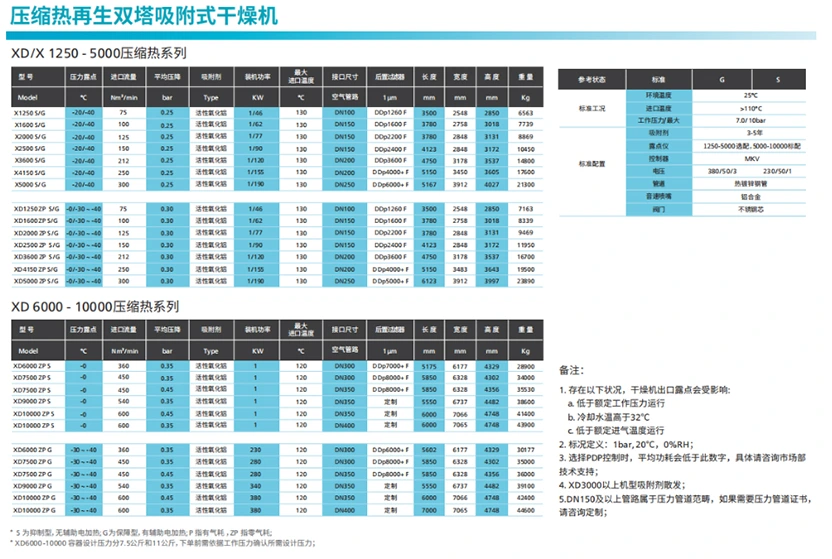 압축 열 재생을 활용하여 재생 온도 및 환경 조건에 따라 -20°C 이하의 이슬점을 달성합니다. 배기 온도가 높은 오일 프리 압축기와 결합하면 이슬점은 -40°C에 도달할 수 있습니다.