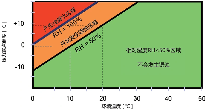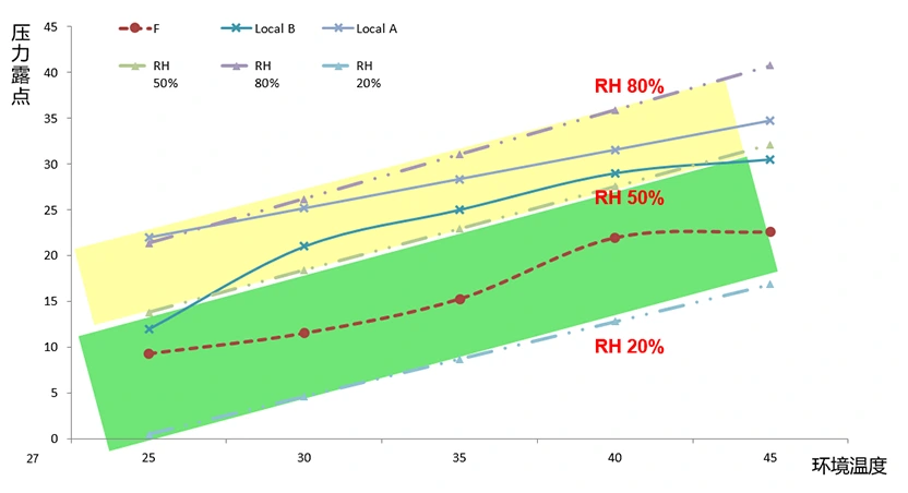 아래 측정 데이터에서 볼 수 있듯이, 압축 공기 입구 압력 7 Bar, 입구 온도 35°C, 압력 노점 7°C, 최종 배기 온도 25°C에서 공기의 상대 습도는 30%로 파이프라인 및 공기 사용 장비의 부식을 효과적으로 방지합니다.