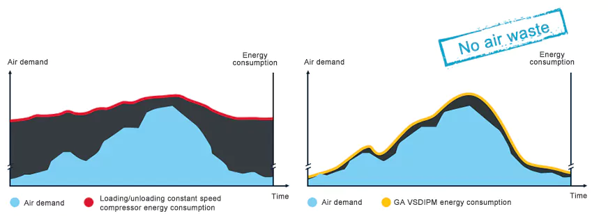 아트라스콥코는 여러 장치를 비교하고 장기 테스트를 실시하여 GAVSD IPM이 GA 고정 주파수 모델보다 평균 35% 이상 더 많은 에너지를 절약한다는 결론을 내렸습니다.