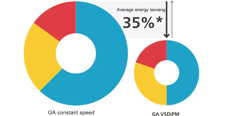 고효율 VSDiPM 시리즈 압축기는 지정된 속도로 구동되는 압축기에 비해 평균 최대 35%*의 에너지를 절약합니다.